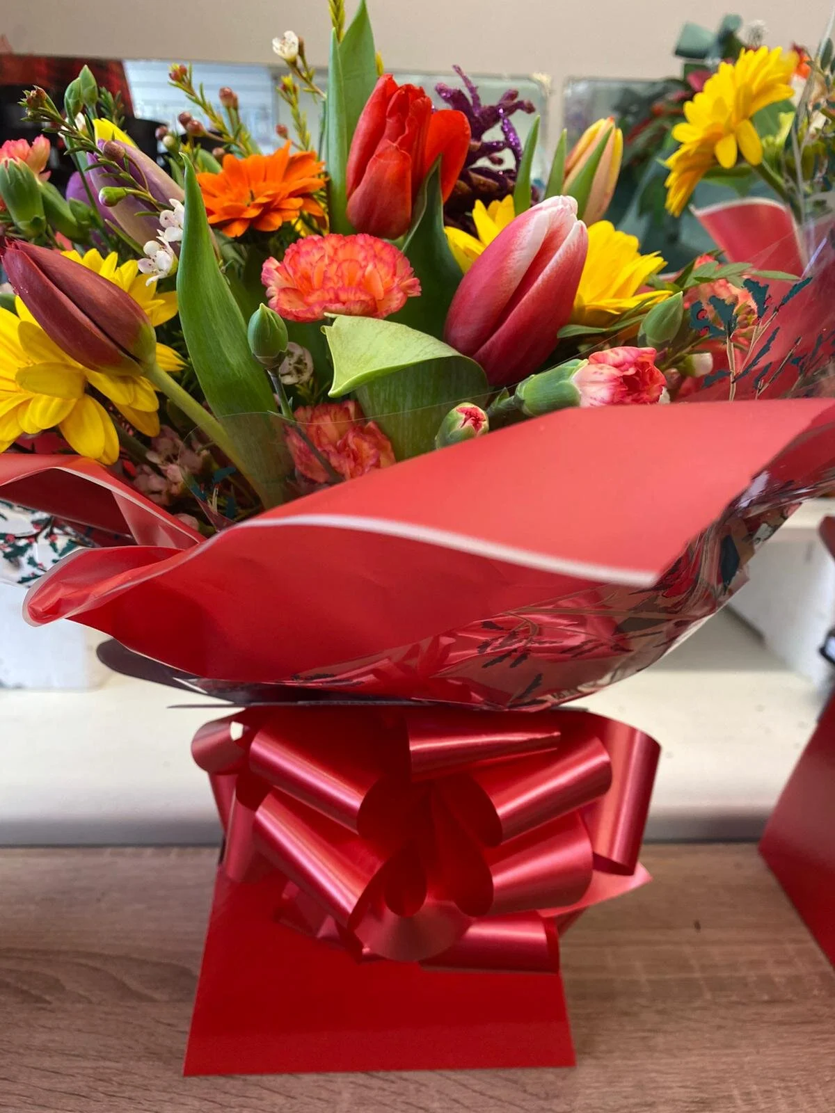 A variety of fresh flowers with seasonal greenery, mixed colours and Christmas-themed wrapping, in a hand-tied bunch.