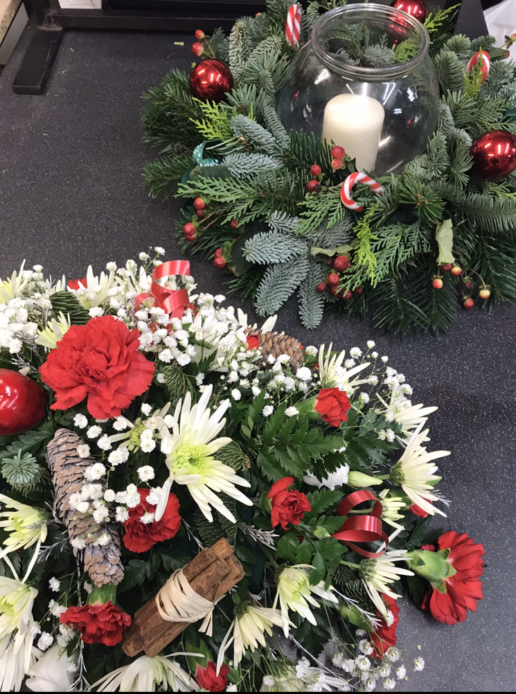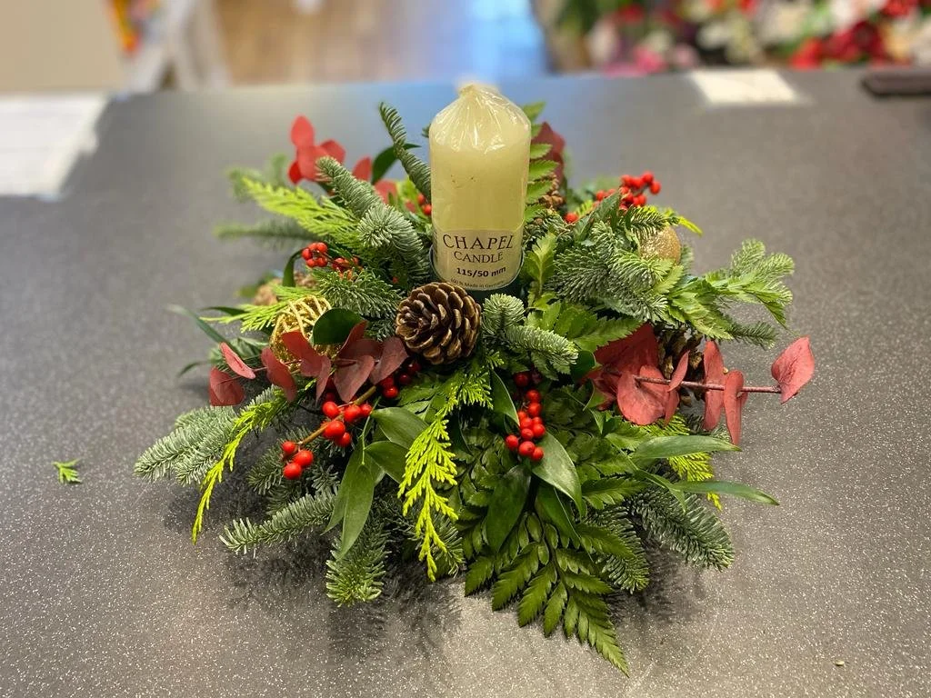A round table arrangement in oasis, filled with fresh seasonal foliage, berries and a mixture of red and white flowers. We can also add a chapel candle in the centre of the arrangement.