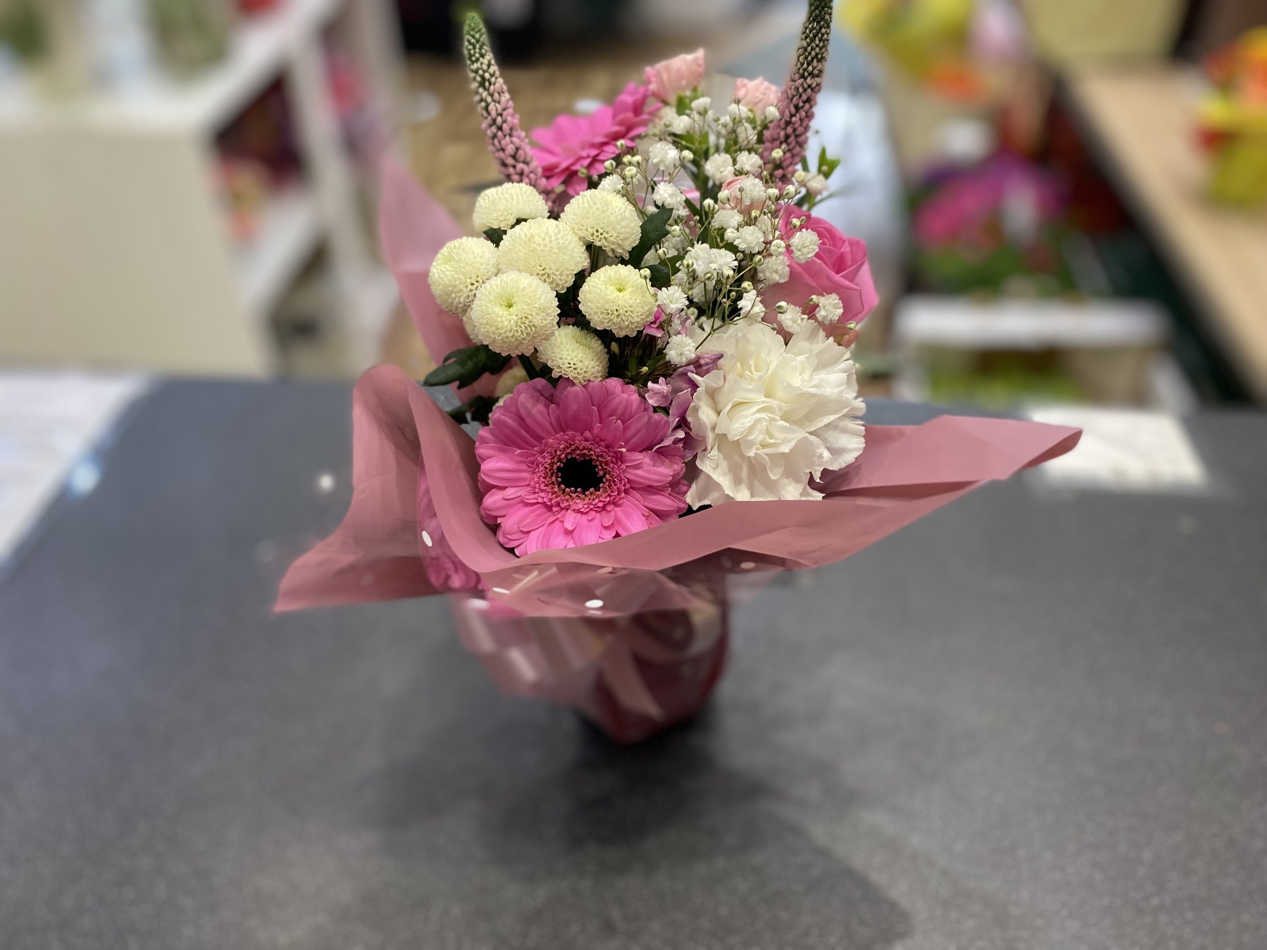 A mixture of seasonal flowers and greenery, in spring-themed wrapping in a hand-tied bunch.