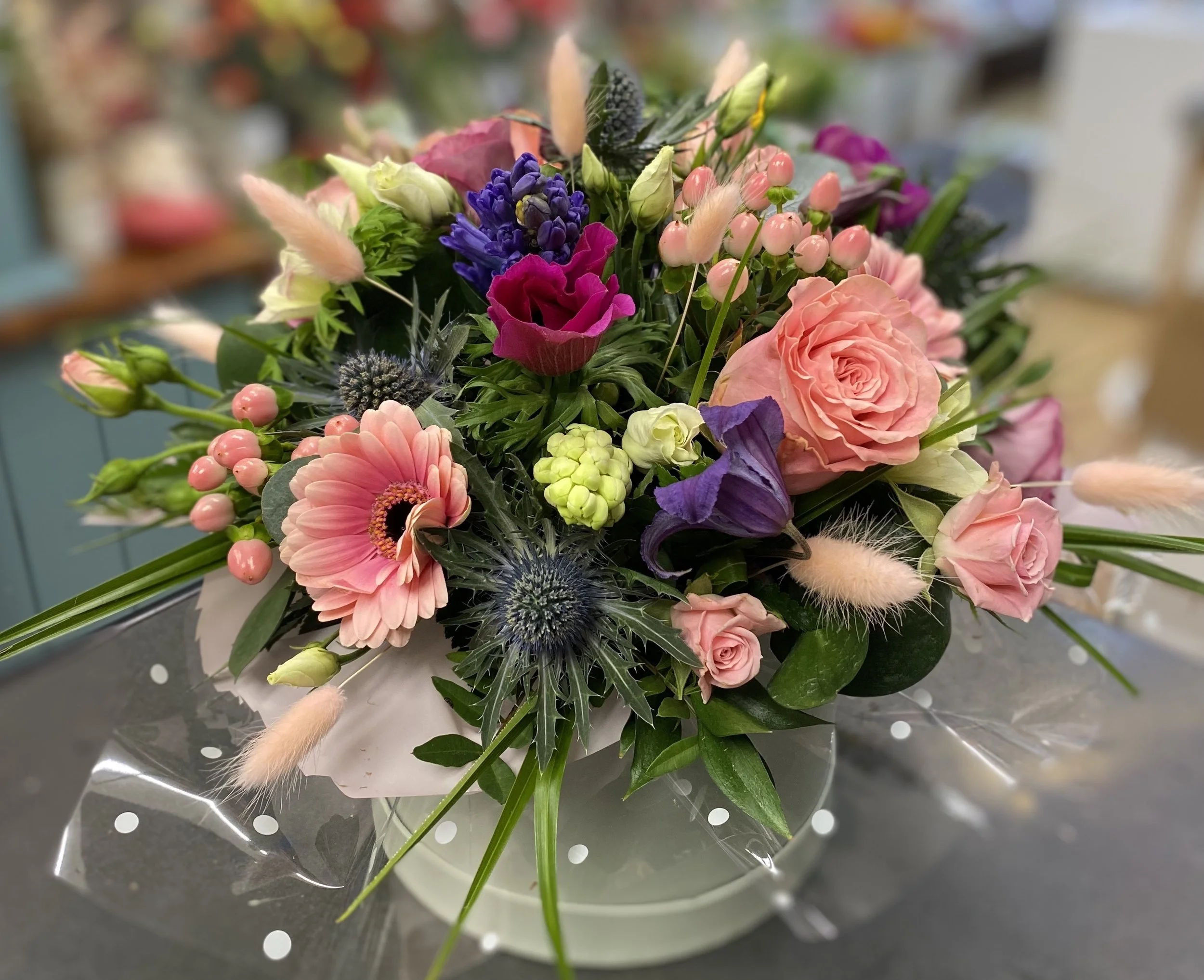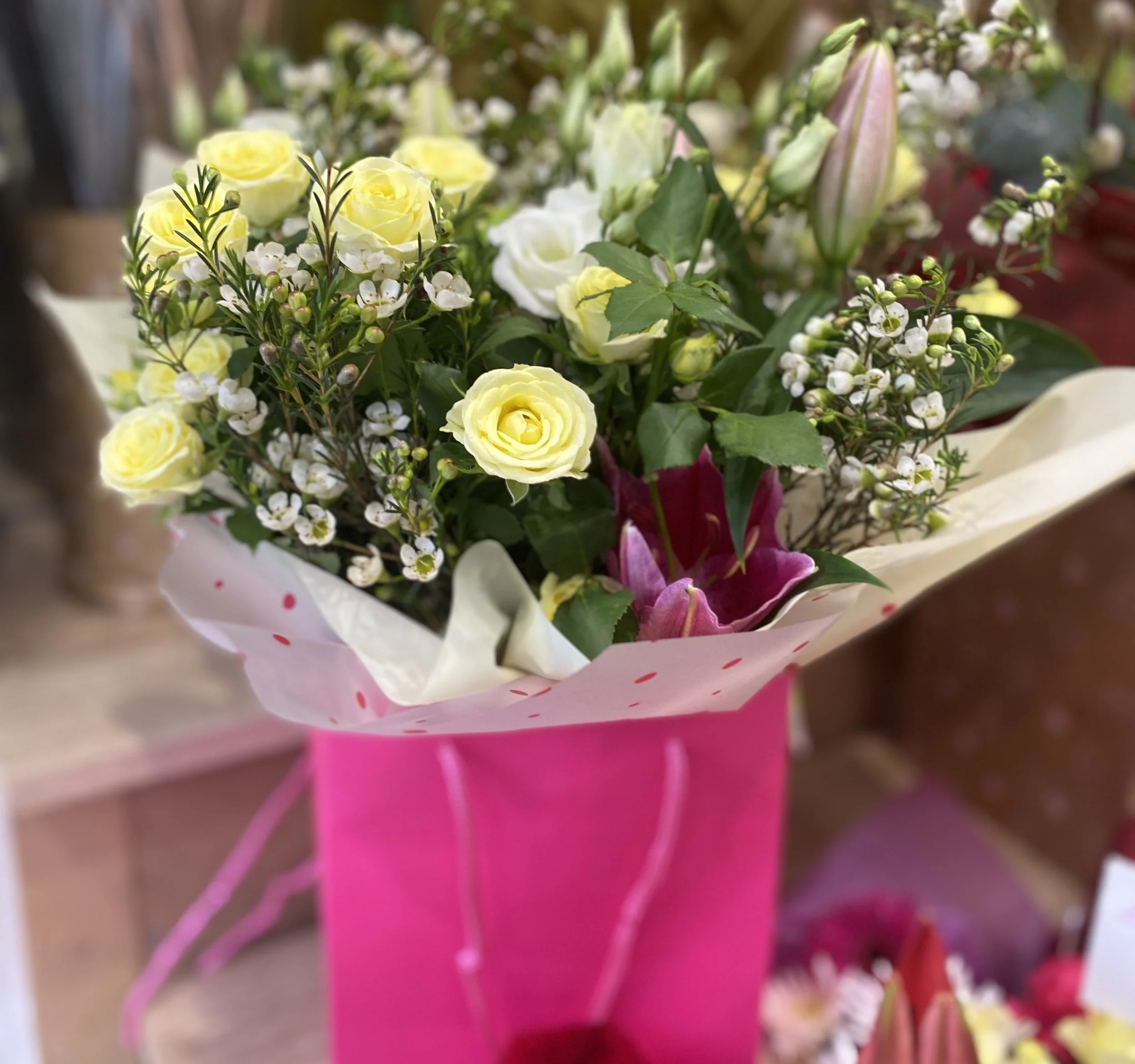 Including a variety of fresh seasonal flowers and greenery in a pretty gift bag and wrapping.