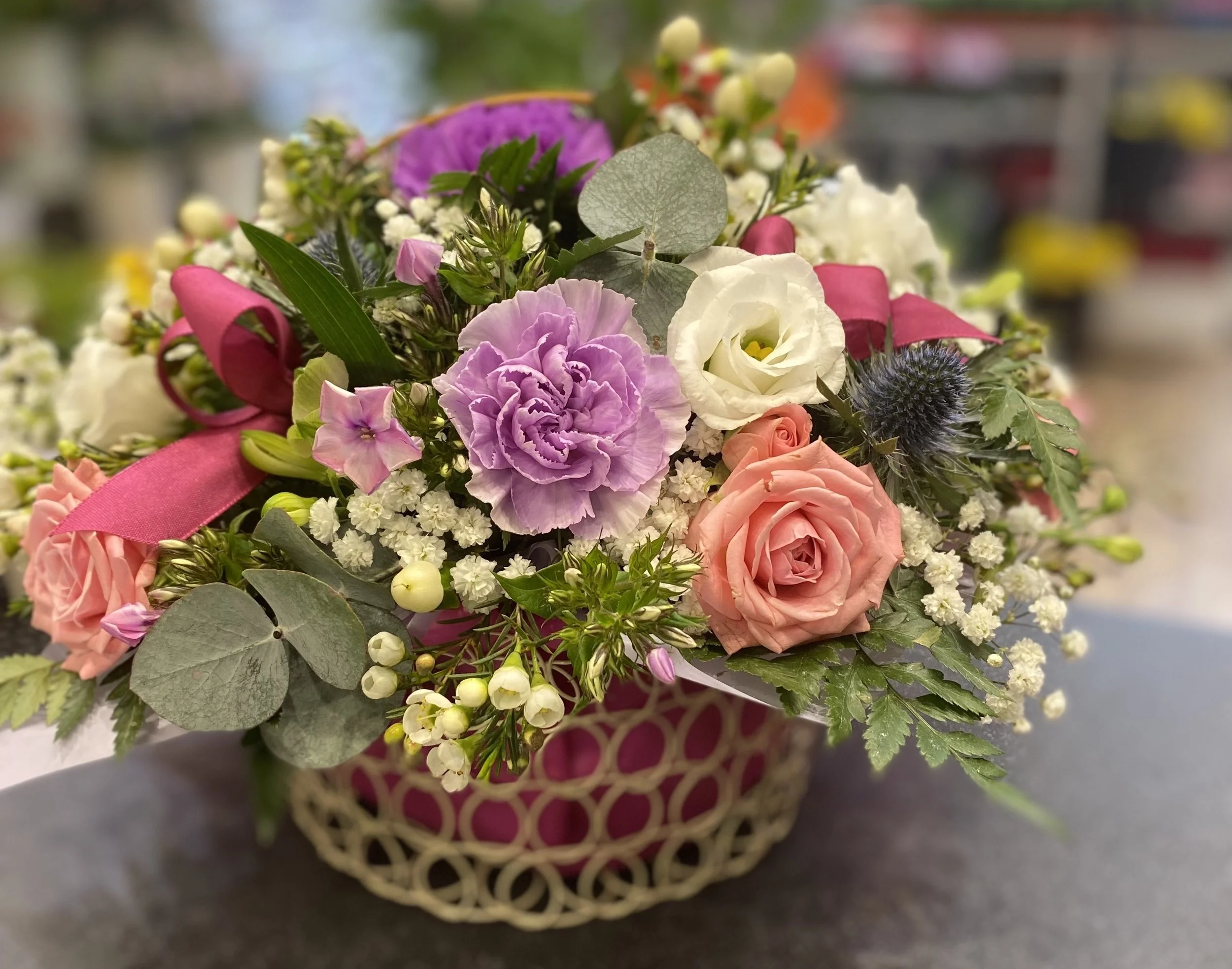Arranged in oasis and a beautiful wicker basket, filled with a mixture of fresh flowers and seasonal greenery.