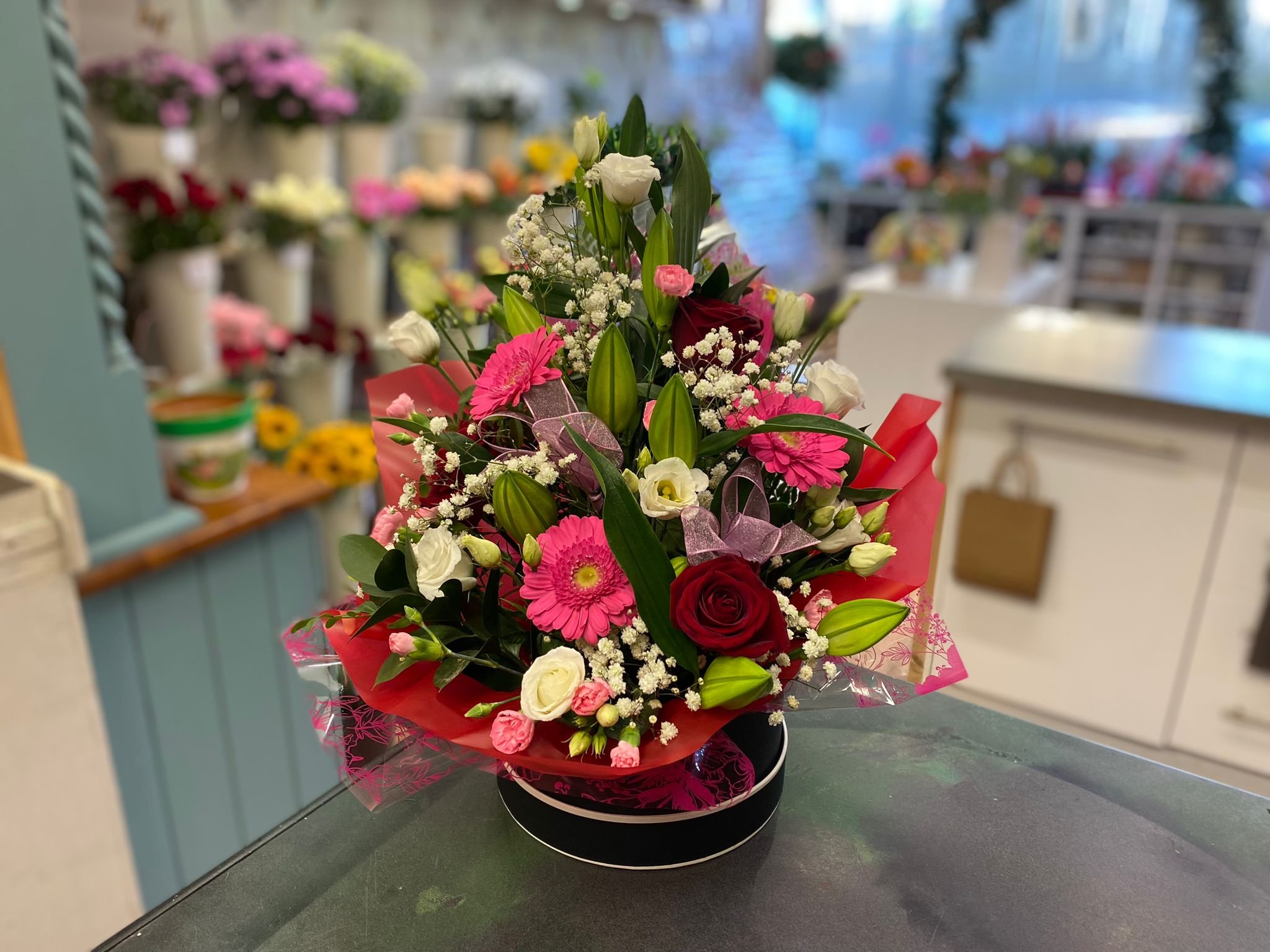 A mixture of fresh flowers, including red roses, in a luxurious hat box.